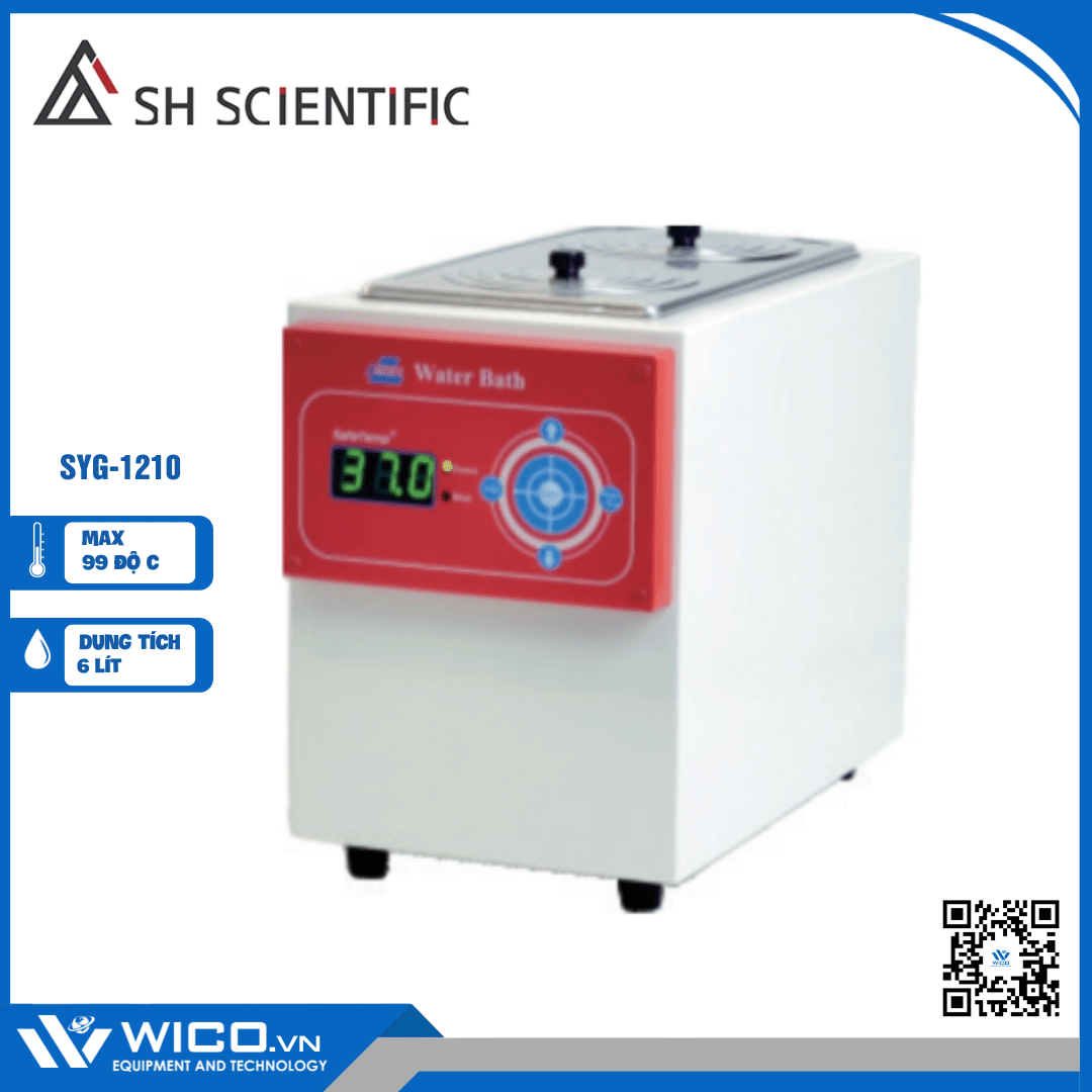 SYG-1210 🌟 Bể cách thuỷ - Điều nhiệt có dung tích 6 lít kiểu nắp 2 lỗ với nhiệt độ tối đa 99 độ C. Bể được thiết kế và chế tạo bởi hãng SH Scientific - Hàn Quốc. Bể có độ chính xác và kiểm soát nhiệt độ ổn định, đáp ứng nhu cầu sử dụng. Sản phẩm được nhập khẩu và phân phối chính hãng bởi Wico Việt Nam. Bảo hành lên tới 12 tháng. Hỗ trợ giao hàng toàn quốc.
