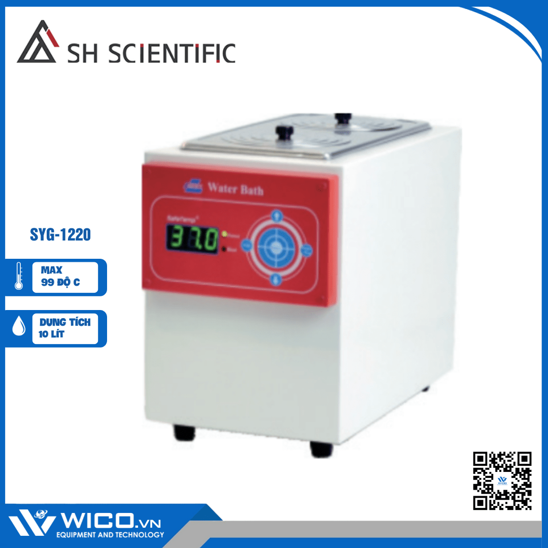 SYG-1220 🌟 Bể cách thuỷ - Điều nhiệt có dung tích 10 lít kiểu nắp 2 lỗ với nhiệt độ tối đa 99 độ C. Bể được thiết kế và chế tạo bởi hãng SH Scientific - Hàn Quốc. Bể có độ chính xác và kiểm soát nhiệt độ ổn định, đáp ứng nhu cầu sử dụng. Sản phẩm được nhập khẩu và phân phối chính hãng bởi Wico Việt Nam. Bảo hành lên tới 12 tháng. Hỗ trợ giao hàng toàn quốc.