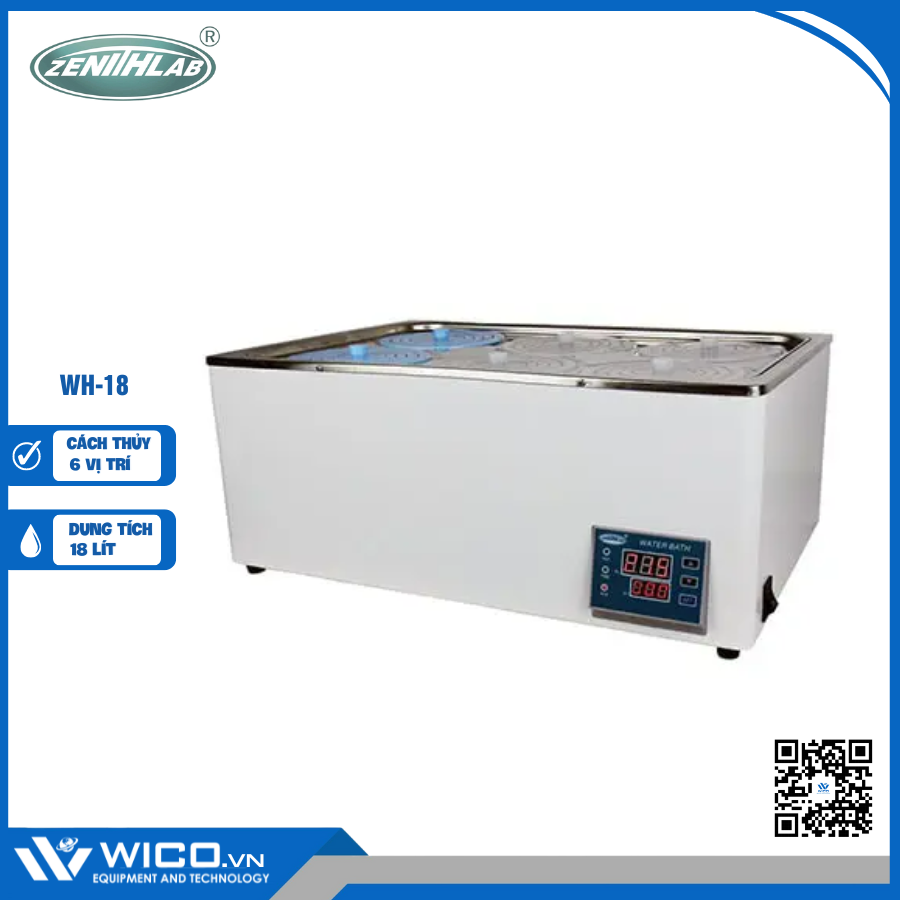 Bể cách thuỷ WH-18 🌟 Điều khiển kỹ thuật số - Màn hình LED. Thiết kế 6 vị trí, dung tích 18 lít, với nắp đậy kiểu vòng tròn đồng tâm. Phù hợp với nhiều loại bình/ cốc thí nghiệm. 100% Hàng chính hãng Zenith Lab Trung Quốc. Được nhập khẩu và phân phối chính hãng bởi Wico Việt Nam. Bảo hành 12 tháng. Hỗ trợ giao hàng trên toàn quốc