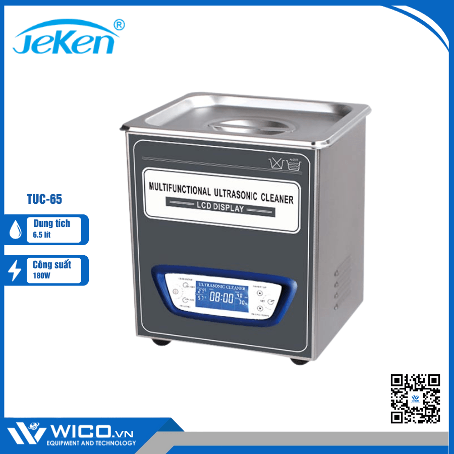 TUC-65 ⭐ Bể rửa siêu âm màn hình LCD dung tích 6.5 Lít có các chức năng: Degas - Sweep và chức năng gia nhiệt. Bể được thiết kế hoàn toàn bằng Inox cao cấp, dễ dàng làm sạch được chế tạo bởi hãng Jeken. Được nhập khẩu và phân phối chính hãng bởi Wico Việt Nam. Bảo hành lên tới 12 tháng. Hỗ trợ giao hàng trên toàn quốc