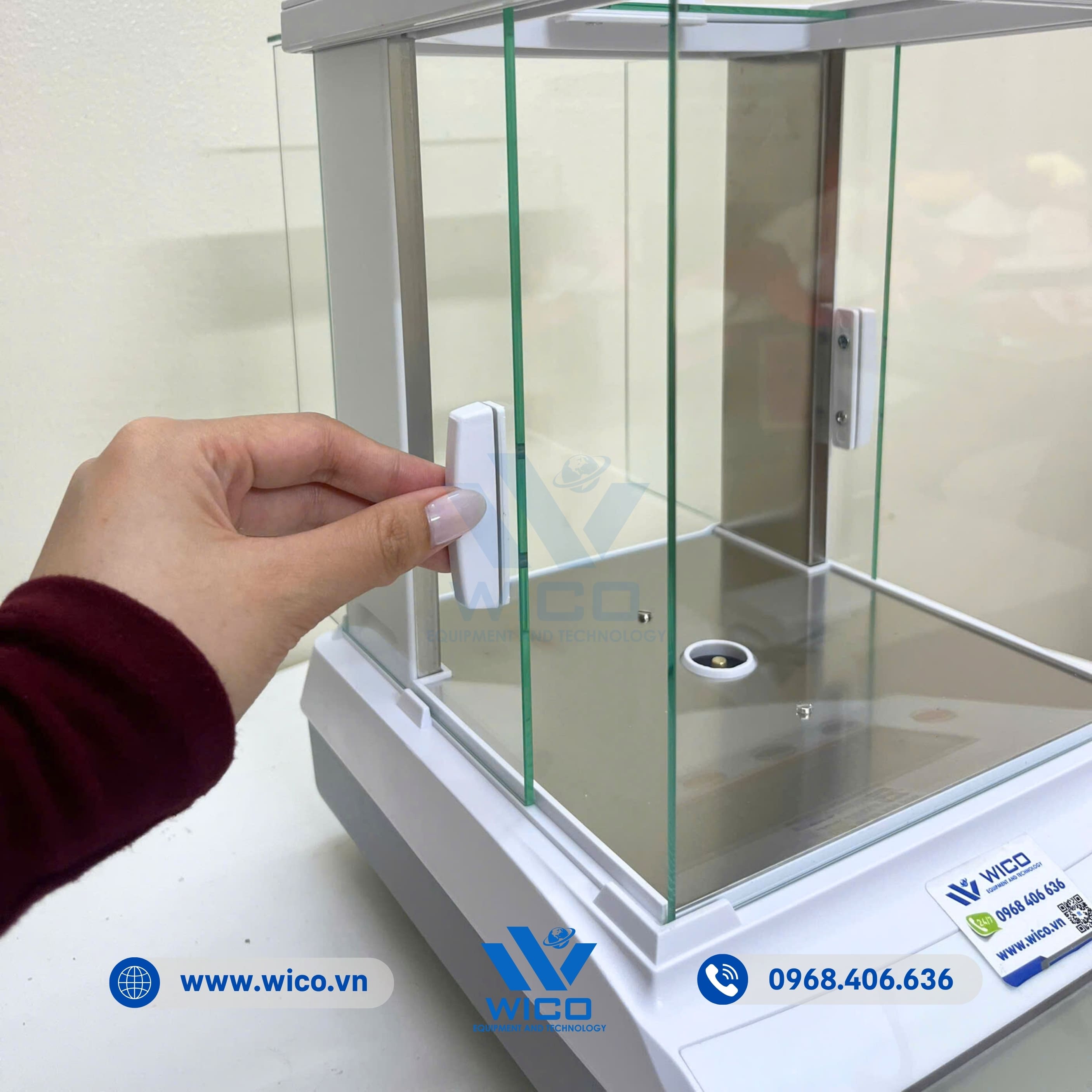 - Kính chắn gió trong suốt, mở kiểu ray trượt giúp người dùng dễ dàng thao tác và quan sát mẫu khi cân.
