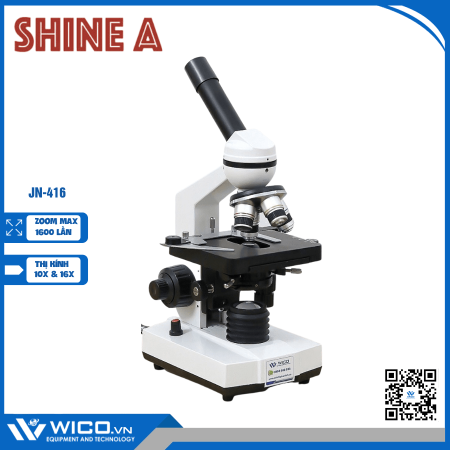 Kính Hiển Vi 1 Mắt 1600 Lần Trung Quốc JN-416 ⭐ Kính hiển vi sinh học 1 mắt được sản xuất bởi hãng Shinea - Trung Quốc. Độ phóng đại tối đa 1000 lần hoặc 1600 lần. Sản phẩm được nhập khẩu và phân phối chính hãng bởi Wico.vn. Cam kết hàng chính hãng - Bảo hành 12 tháng.