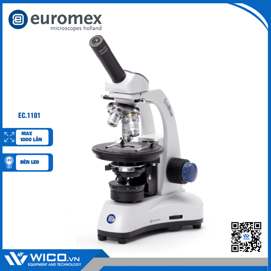 EC.1101 ⭐ Kính hiển vi sinh học 1 mắt với độ phóng đại tối đa 1000 lần khi dùng với thị kính 10X và vật kính 100X. Sản phẩm do hãng Euromex- Hà lan sản xuất, được nhập khẩu và phân phối chính hãng bởi Wico Việt Nam