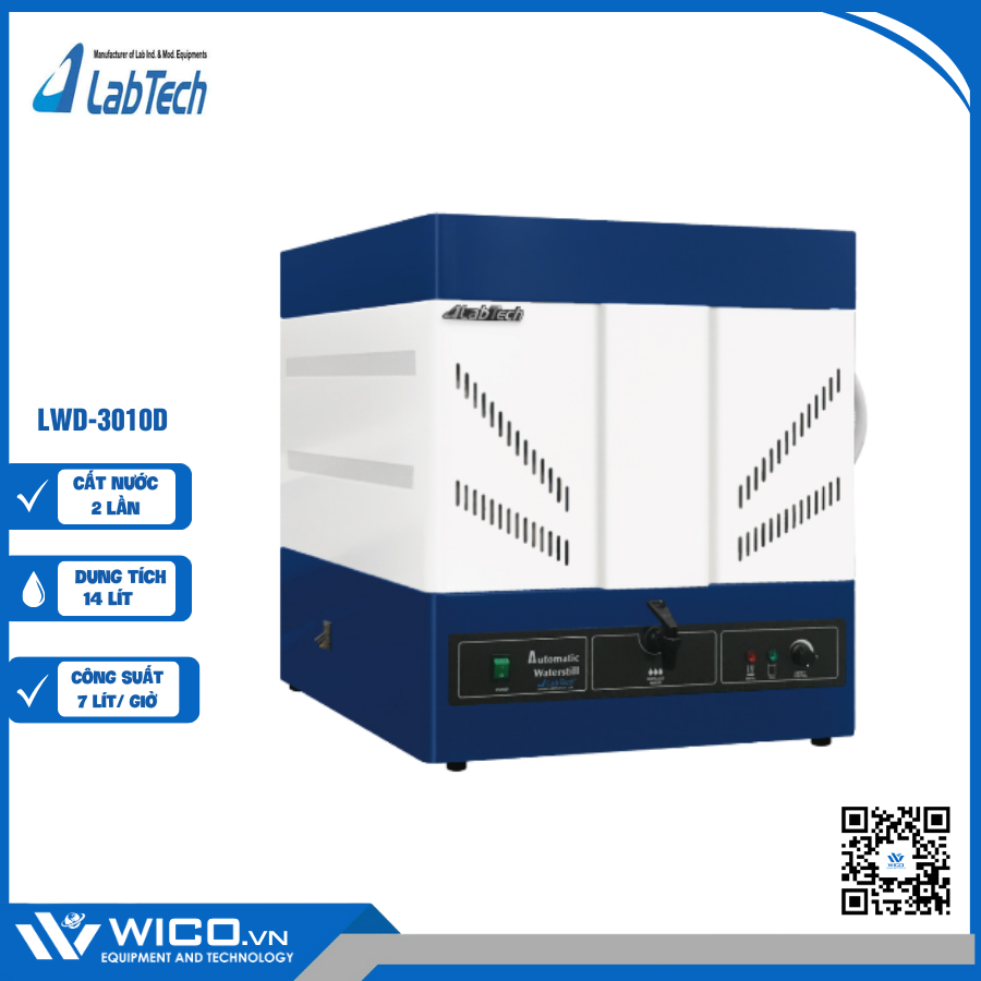 LWD-3010D là dòng máy cất nước 2 lần hoàn toàn tự động do hãng Labtech thiết kế và chế tạo. Với thiết kế nhỏ gọn, toàn bộ máy và bể chứa nước thành phẩm 14 lít được lắp đặt trong 1 khung máy bằng thép cán nguội sơn phủ Epoxy. Sản phẩm được nhập khẩu và phân phối chính hãng bởi Wico Việt Nam.