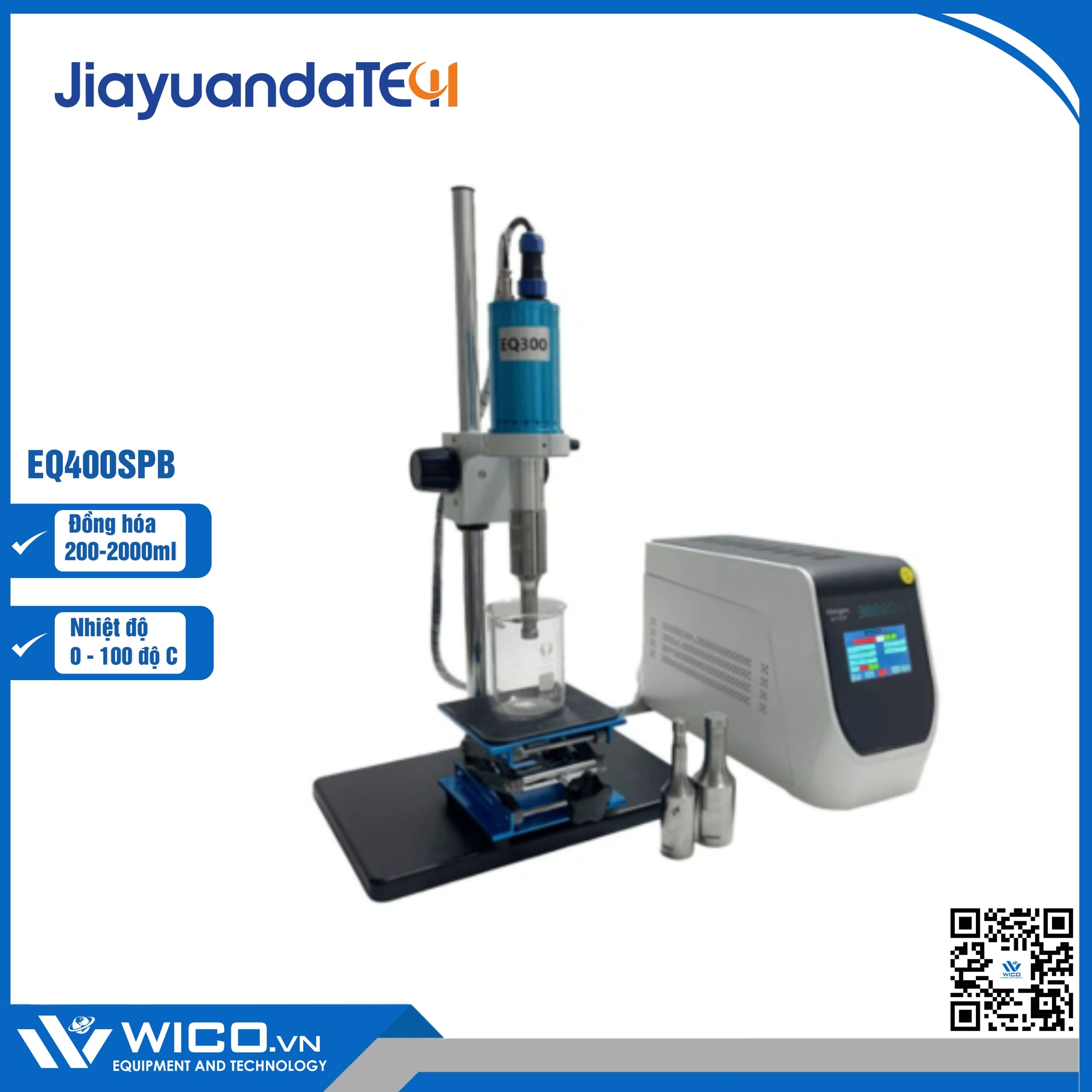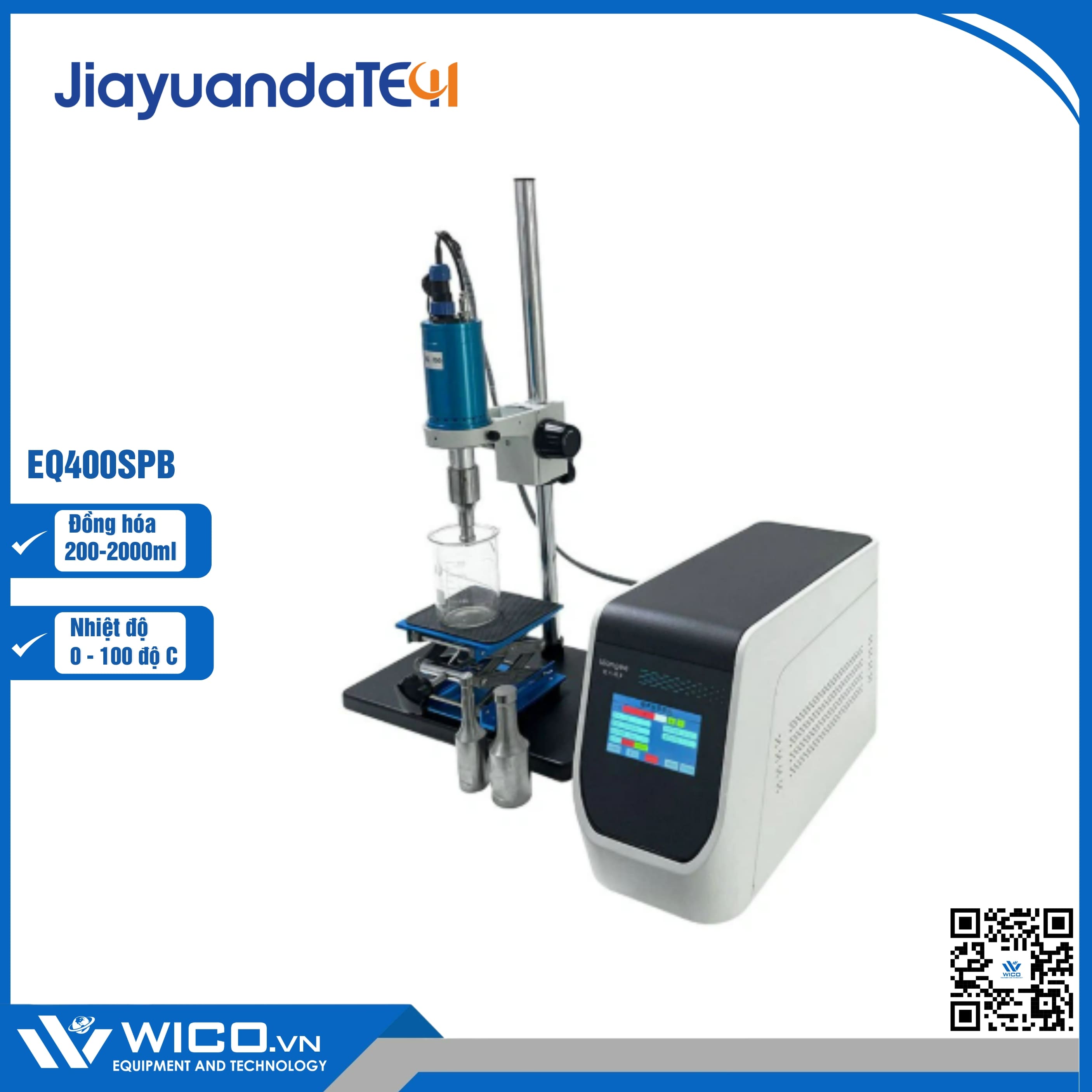 EQ400SPB ⭐ Máy đồng hóa mẫu bằng sóng siêu âm với 100% sản phẩm chính hãng Jiayuanda – Trung Quốc. Máy có khả năng đồng hóa 200-2000ml (Tùy đầu đồng hóa) với công suât siêu âm 400W, nhiệt độ cài đặt tối đa 100 độ C. Sản phẩm được nhập khẩu và phân phối bởi Wico. Bảo hành 12 tháng, hỗ trợ giao hàng toàn quốc