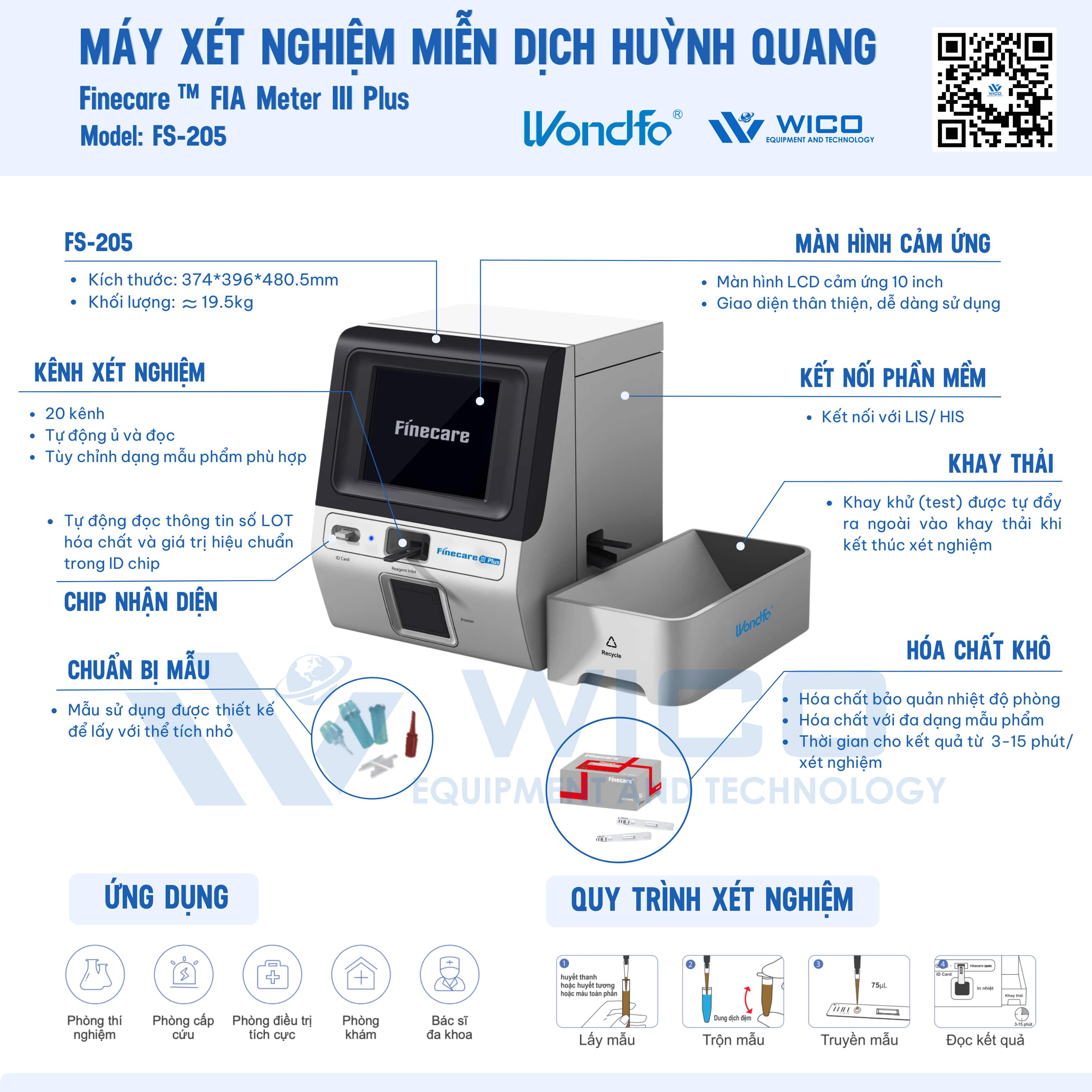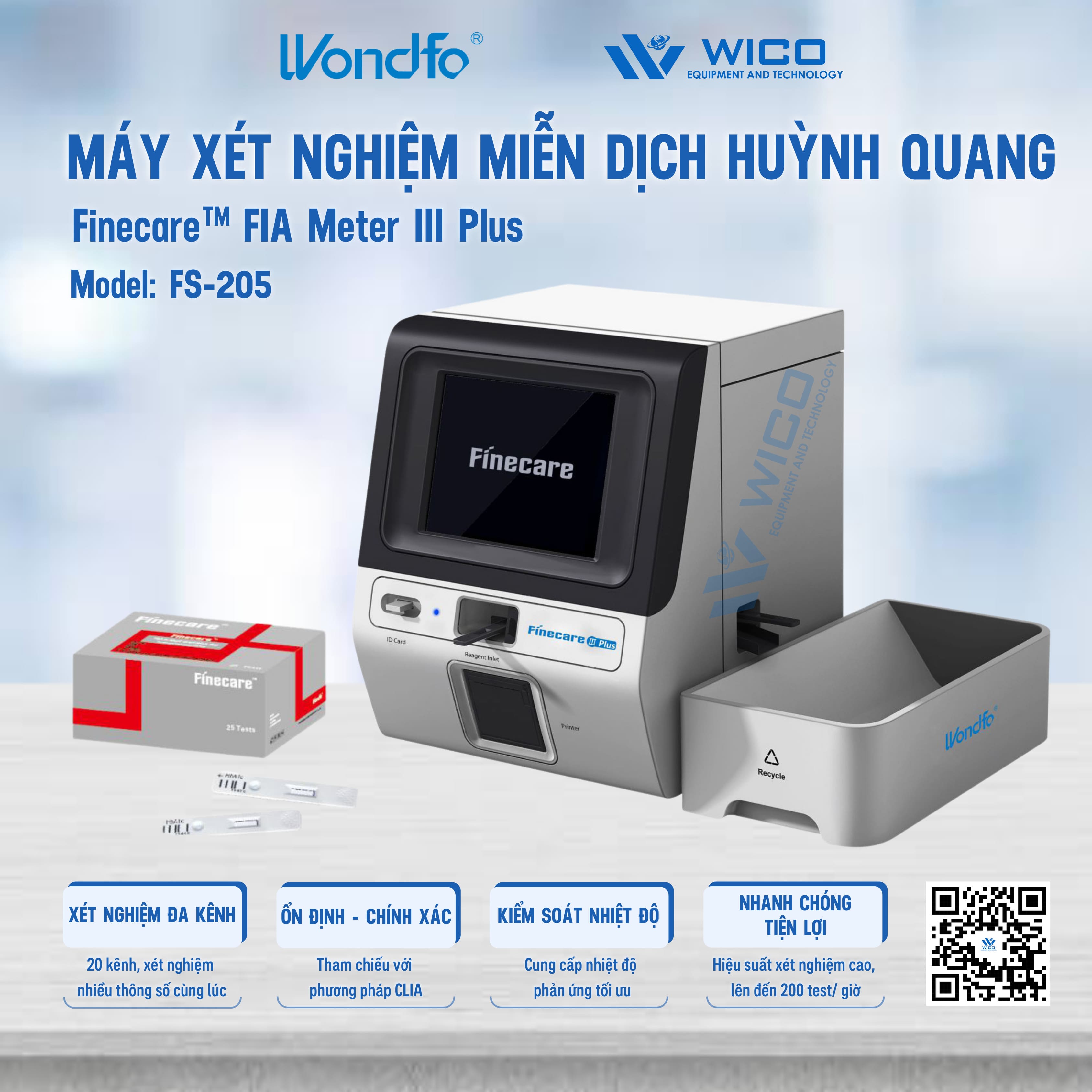 Máy xét nghiệm miễn dịch Huỳnh Quang FINECARE FS-205 ⭐ Hệ thống xét nghiệm miễn dịch huỳnh quang có kiểm soát nhiệt độ bên trong do hãng Wondfo sản xuất. Được sử dụng để để hỗ trợ chẩn đoán tình trạng bệnh lây nhiễm, tim mạch,đường huyết, tổn thương thận, nội tiết tố và ung thư... Có khả năng xét nghiệm nhiều thông số cùng lúc. Tham chiếu với phương pháp CLIA - Kết quả ổn định - chính xác. Với hiệu xuất xét nghiệm cao lên đến 200 test/ giờ.