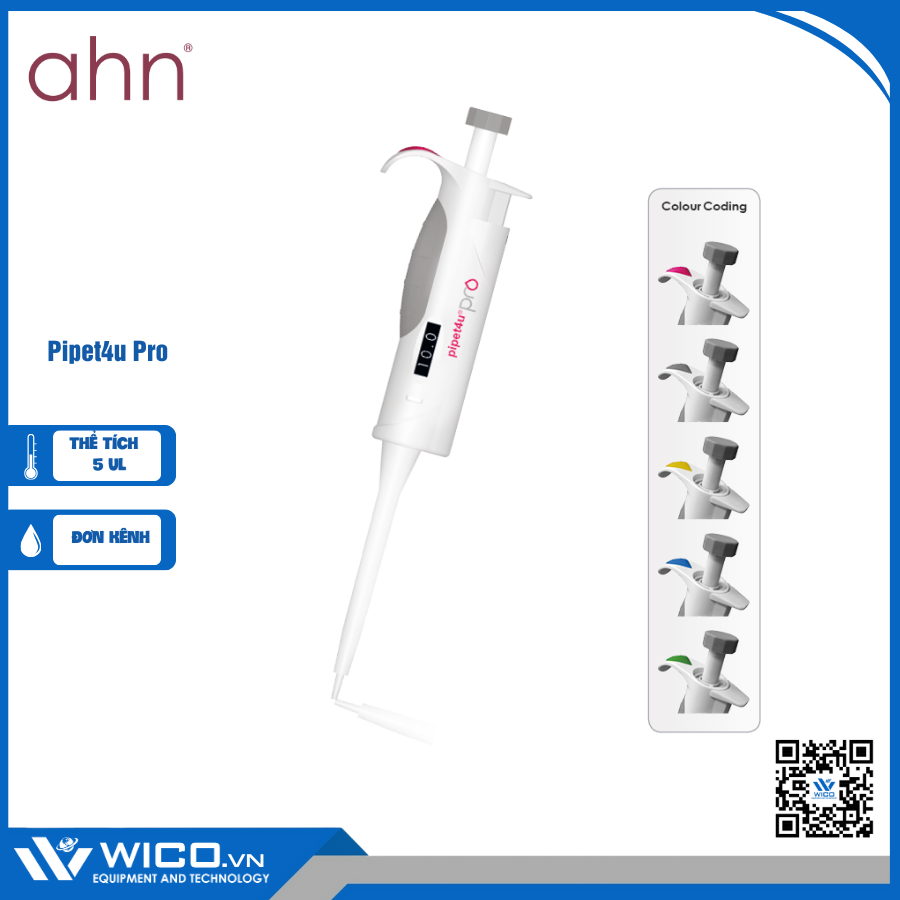 - Mỗi micropipet AHN pipet4u pro đi kèm với một màu được mã hóa theo thể tích của micropipette. Bằng cách này, người dùng có thể dễ dàng chọn Pipet một kênh phù hợp.