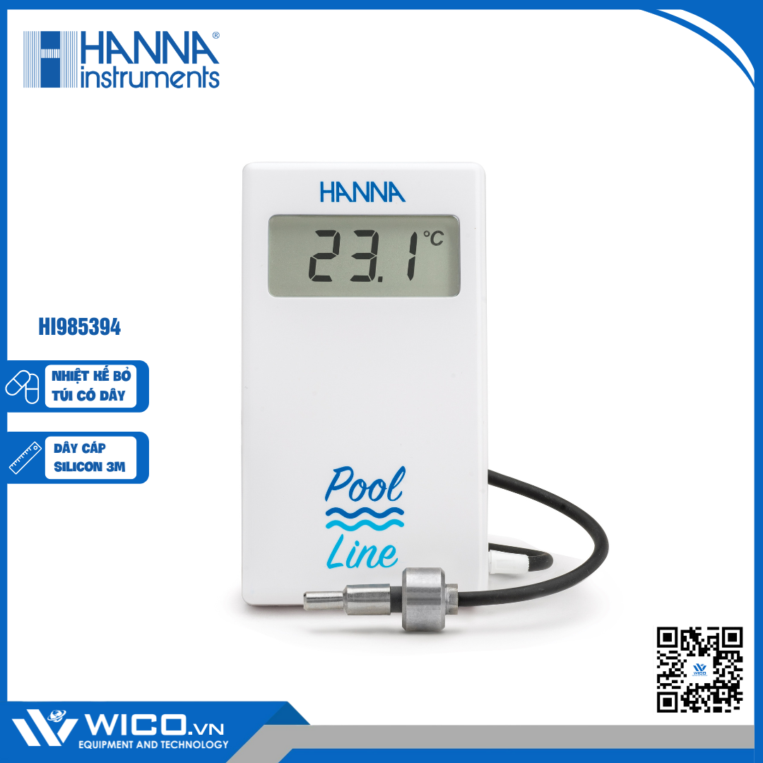 Nhiệt kế dạng túi nhỏ gọn HI985394 có dây nhúng chìm cho hồ bơi bằng silicon dài 3m là sản phẩm của hãng Hanna và được phân phối chính hãng bởi Wico Việt Nam