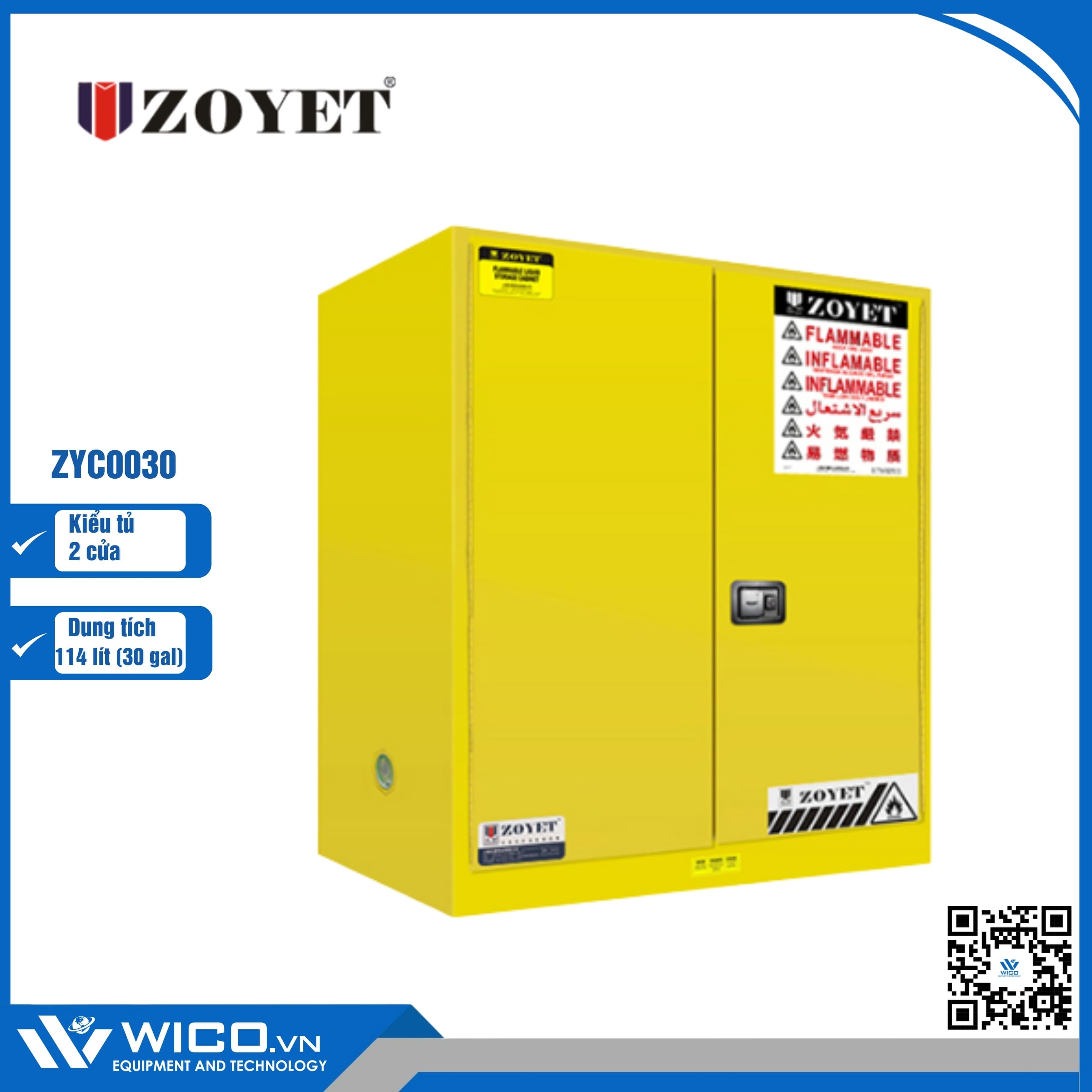 ZYC0030 ⭐ Tủ an toàn chống cháy 2 cửa với dung tích 114 lít (30 gal) do hàng Zoyet - Trung Quốc sản xuất. Sản phẩm được nhập khẩu và phân phối bởi Wico. Bảo hành 12 tháng, hỗ trợ giao hàng toàn quốc. Là thiết bị chuyên dụng để lưu trữ các chất dễ cháy, dễ nổ, độc hại hoặc các vật phẩm có giá trị cao, đảm bảo mang lại sự bảo vệ an toàn ở mức cao nhất