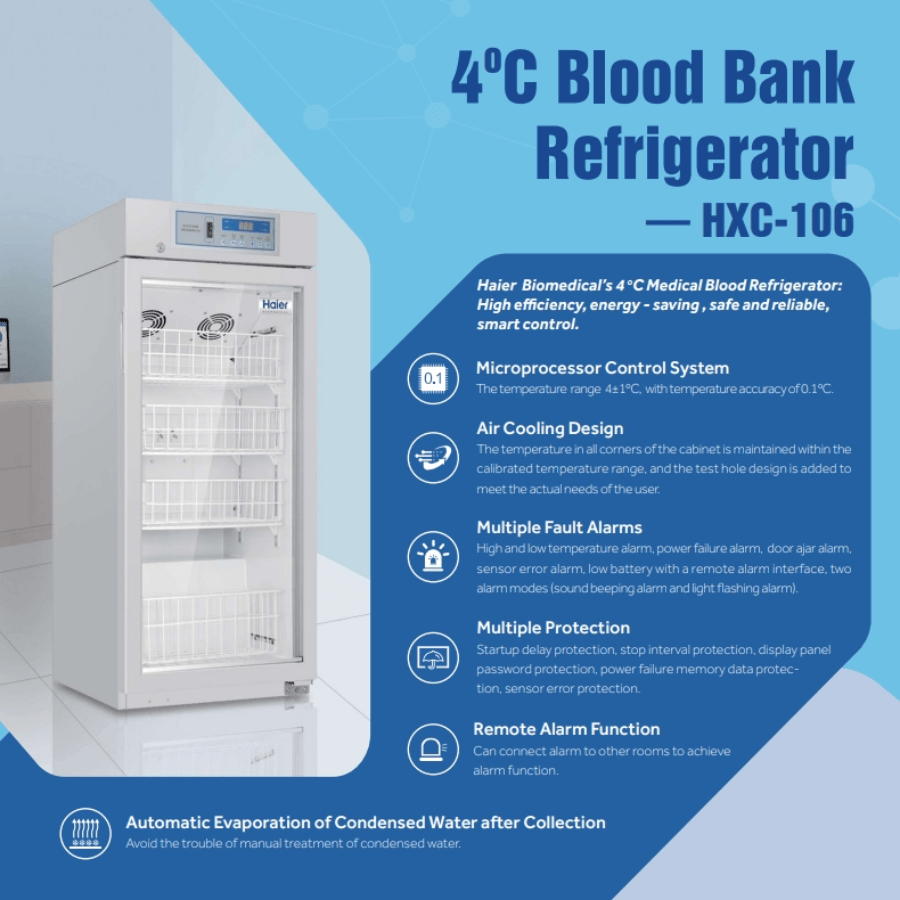 HXC-106⭐Tủ lạnh trữ máu, tủ trữ mẫu do hãng Haier BioMedical (đạt tiêu chuẩn WHO, GPM, ISO, CE...) thiết kế và chế tạo. Với dung tích 106 lít, thiết kể kiểu tủ đứng, cửa trước dễ dàng sử dụng. Phạm vi nhiệt độ điều khiển từ 4±1 độ C. Hệ thống làm lạnh cưỡng bức dòng khí điều khiển vi xử lý cùng với hệ thống bù nhiệt điện tử. Nhập Khẩu và Phân Phối bởi Wico Việt Nam. Cam kết 100% sản phẩm chính hãng. Bảo hành lên tới 12 tháng. Hỗ trợ giao hàng toàn quốc.